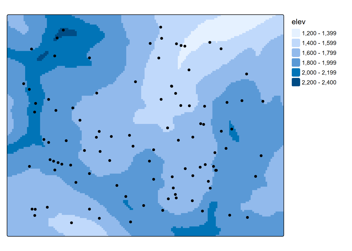 Then we’ll create 200 random xy points 9.2.3 within the extent of elev, and assign it the same crs.
