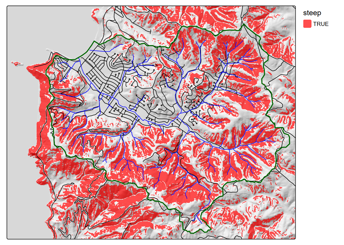 Exercise 8.4 Create a slope raster from the dem TIFF in the SanPedro folder in igisci, then a “steep” raster of all slopes > 26 degrees, determined by a study of landslides to be a common landslide threshold, then display them along with roads “SanPedro/roads.shp” in “black”, streams “SanPedro/streams.shp” in “blue”, and watershed borders “SanPedro/SPCWatershed.shp” in “darkgreen” with lwd=2, using methods from 8.2, figure 8.9.