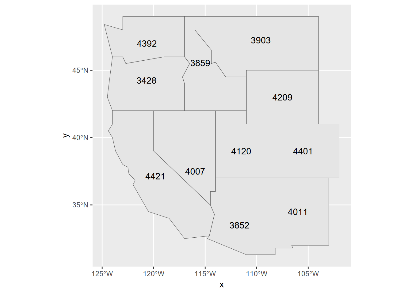 Exercise 7.1 Maximum Elevation Assuming you wrote them in the last chapter (exercise questions 5 and 6), read in your western states and peaks data (pay attention to what folder they are stored in), then use a spatial join to add the peak points to the states to provide a new attribute maximum elevation, and use methods from 6.6 to display those as point labels. Note that joining from the states to the peaks works because there’s a one-to-one correspondence between states and maximum peaks. (If you didn’t write them, you’ll need to repeat your code that built them from the previous chapter.)