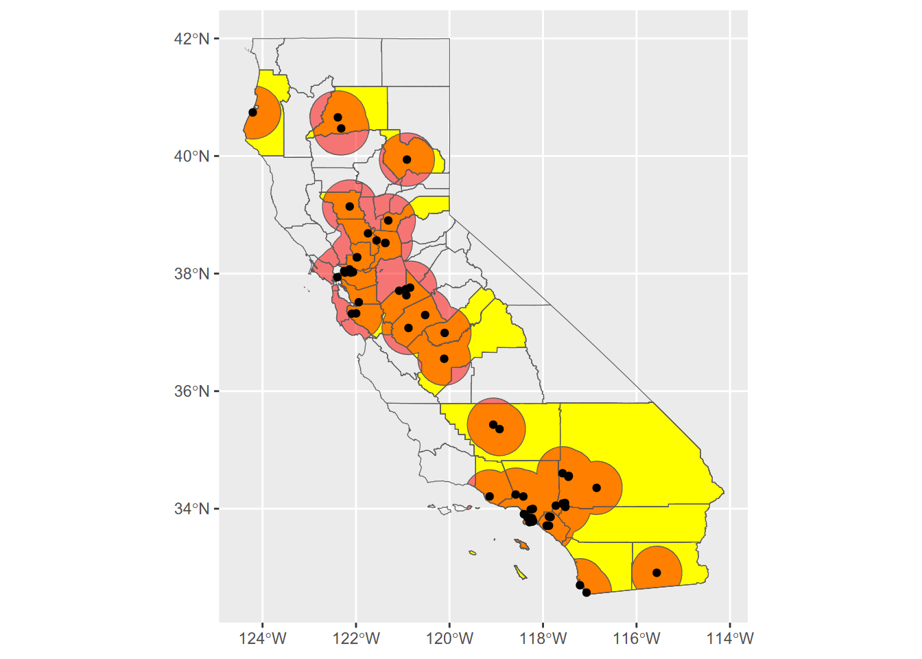 Exercise 7.5 Create an sf that represents all areas within 50 km (see 7.2.4) of a TRI facility in California that has >10,000 pounds of total stack air release for all gases, clipped (intersected) with the state of California as provided in the CA counties data set. Then use this to create a map of California showing the clipped buffered areas in red, with California counties and those selected large-release TRI facilities in black dots, as shown here. For the buffer distances, make sure to use the function described in 7.2.4.1 to get the units right despite the map being in GCS. Methods from 3.4.5 will be useful, and you’ll need to use st_make_valid with buffer results to avoid errors.