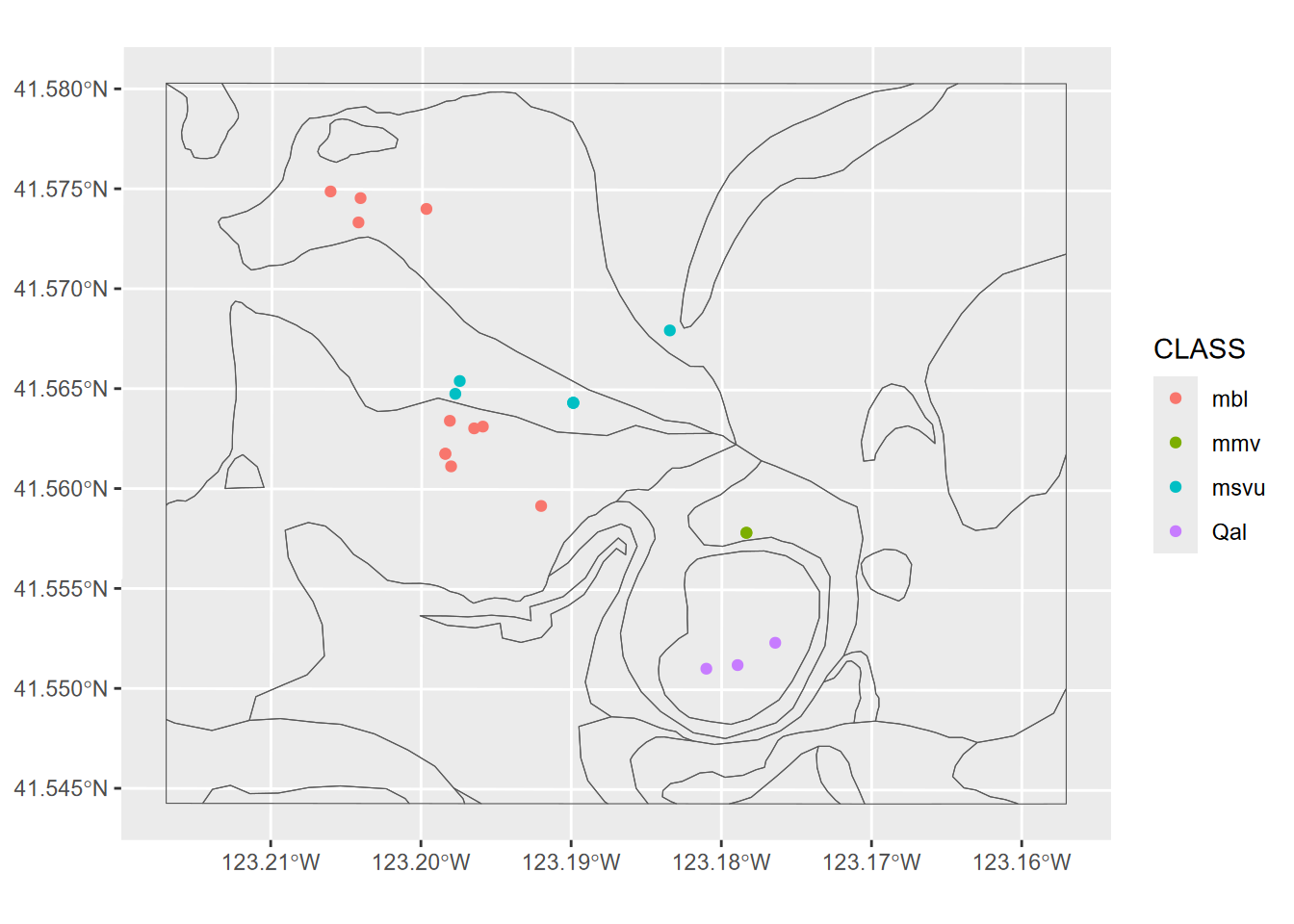 Clipping a GIS layer to a rectangle (or to a polygon) is often useful. We’ll clip to a rectangle based on latitude and longitude limits we’ll specify, however since our data is in UTM, we’ll need to use st_transform to get it to the right coordinates (Figure 7.16).