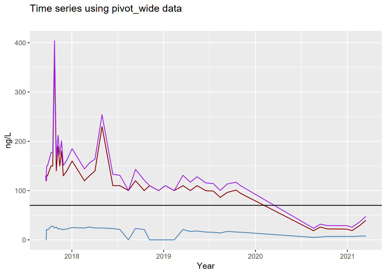 cal_pfs_join, to create the graph shown here (see 4.4.3.1 and 4.7), plotting the three variables (PFOS,PFOA,SUMPFS) with different colored lines of your choice. Add a horizontal reference line (geom_hline(yintercept = 70)) for the HAL limit at 70. Note that the axis labels have been clarified (see 4.7).