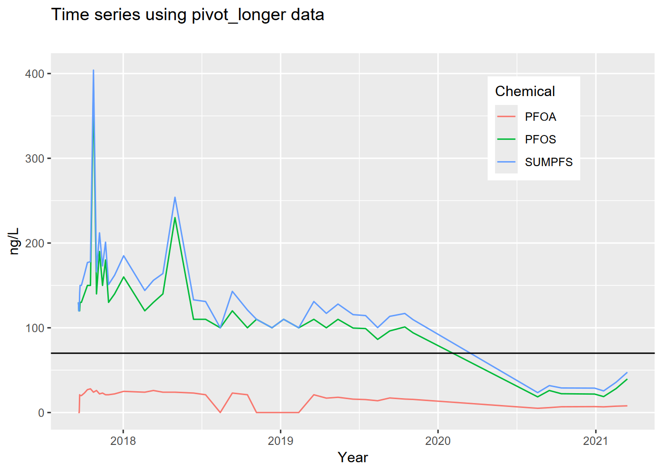 cal_pfs_longusing DATE on the x axis andnglon the y axis. Distinguish the chemicals by setting the line color toChemicalin the aesthetics. As before, add the horizontal reference at 70 and improve the axis labels, but also tweak where the legend goes (see 4.7).