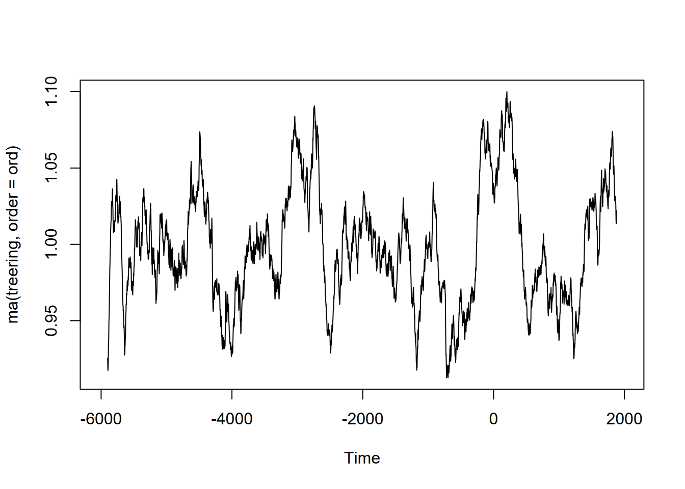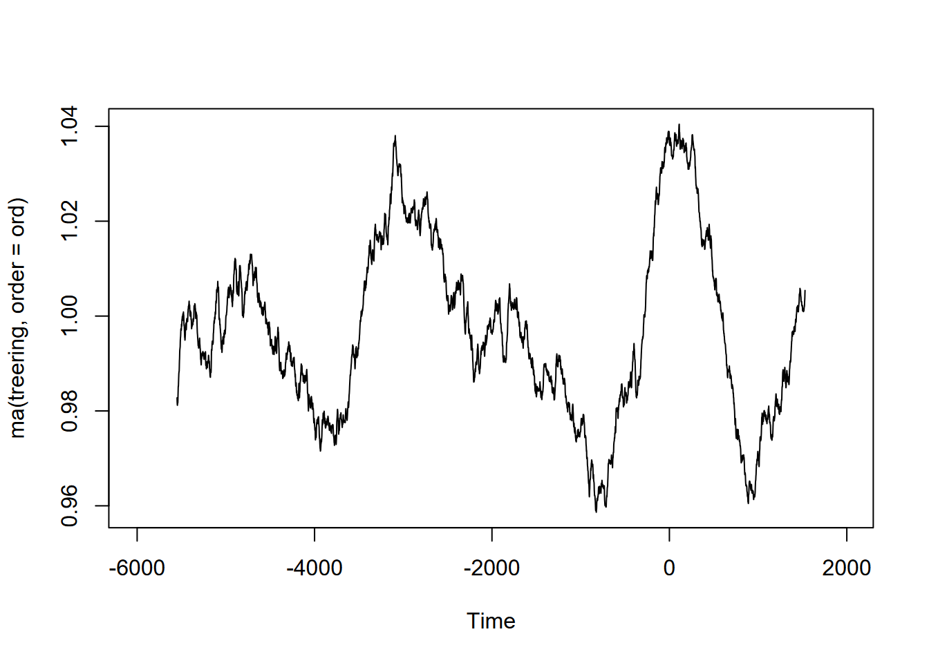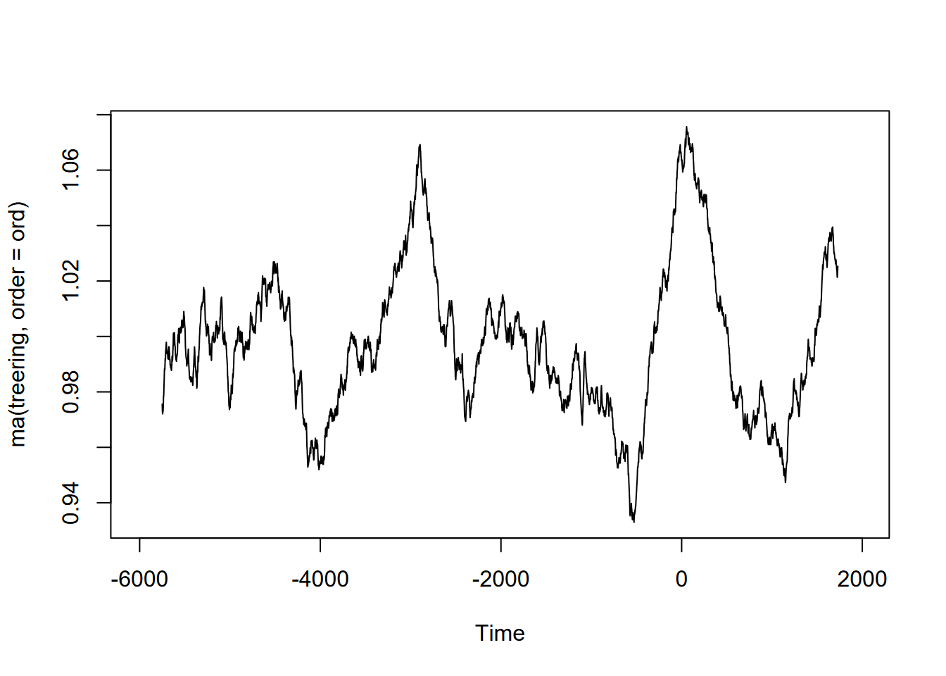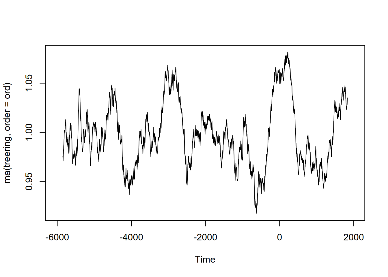 Exercise 12.10 (Optional) Tree-ring data: Using forecast::ma and the built-in treering time series, find a useful order value for a curve that communicates a pattern of tree rings over the last 8,000 years, with high values around -3,500 and 0 years. Note: the order may be pretty big, and you might want to loop through a sequence of values to see what works. I found that creating a sequence in a for loop with seq(from=100,to=1000,by100) useful, and any further created some odd effects.