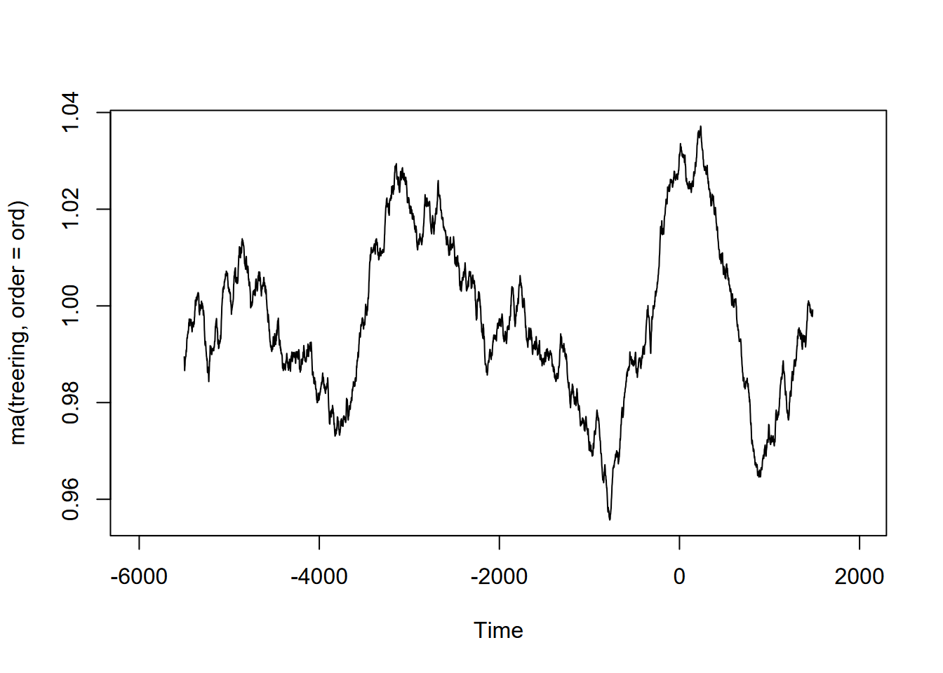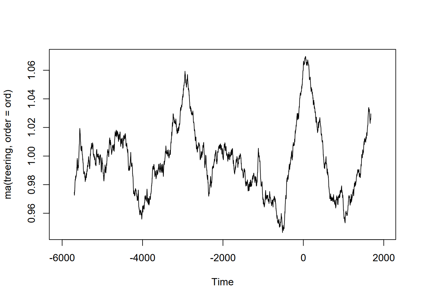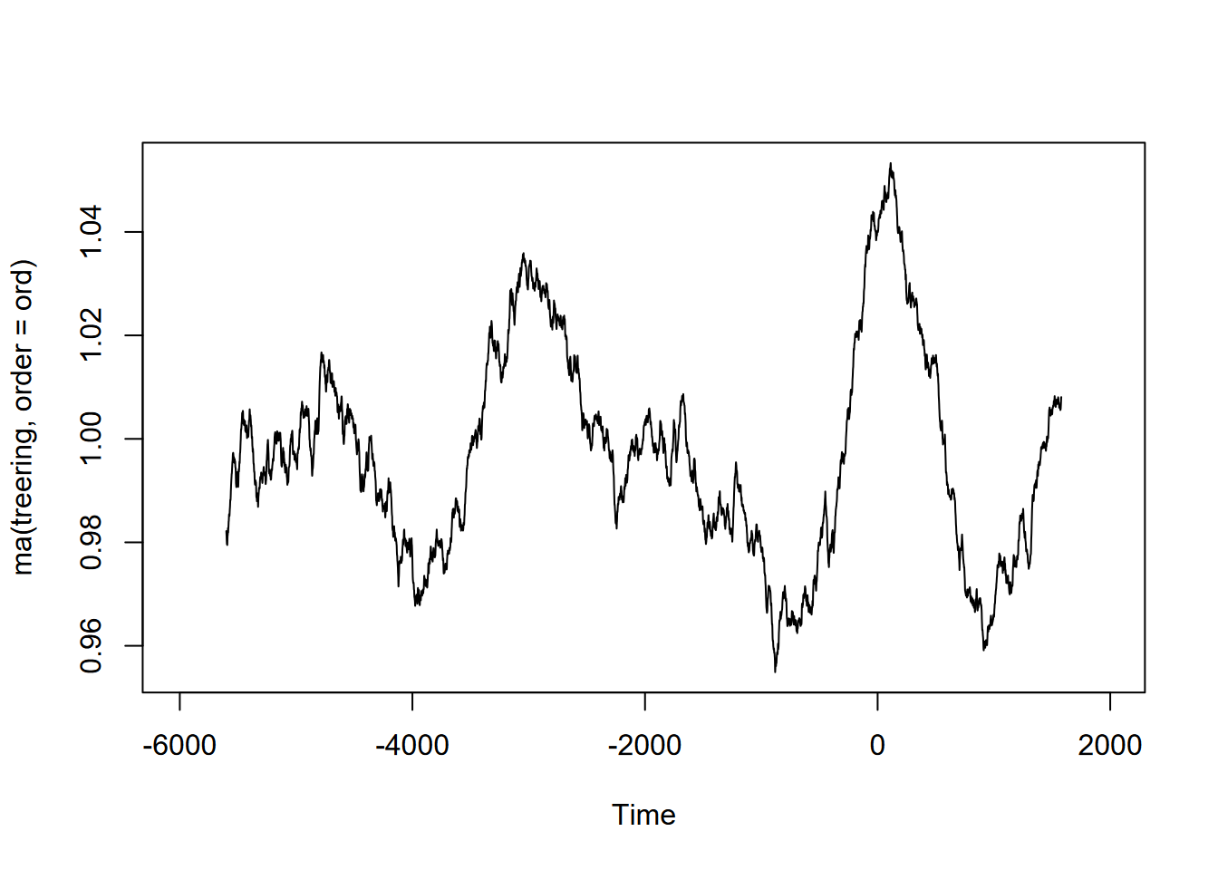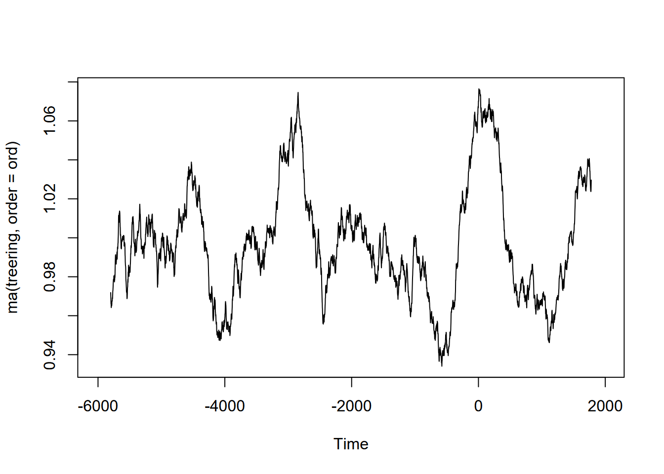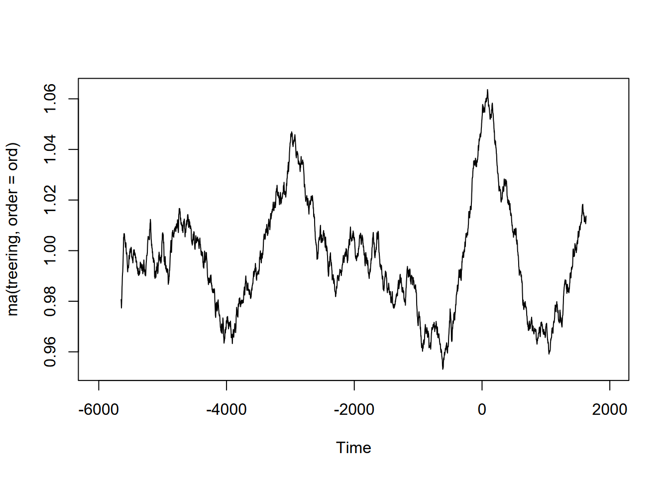 Exercise 12.10 (Optional) Tree-ring data: Using forecast::ma and the built-in treering time series, find a useful order value for a curve that communicates a pattern of tree rings over the last 8,000 years, with high values around -3,500 and 0 years. Note: the order may be pretty big, and you might want to loop through a sequence of values to see what works. I found that creating a sequence in a for loop with seq(from=100,to=1000,by100) useful, and any further created some odd effects.