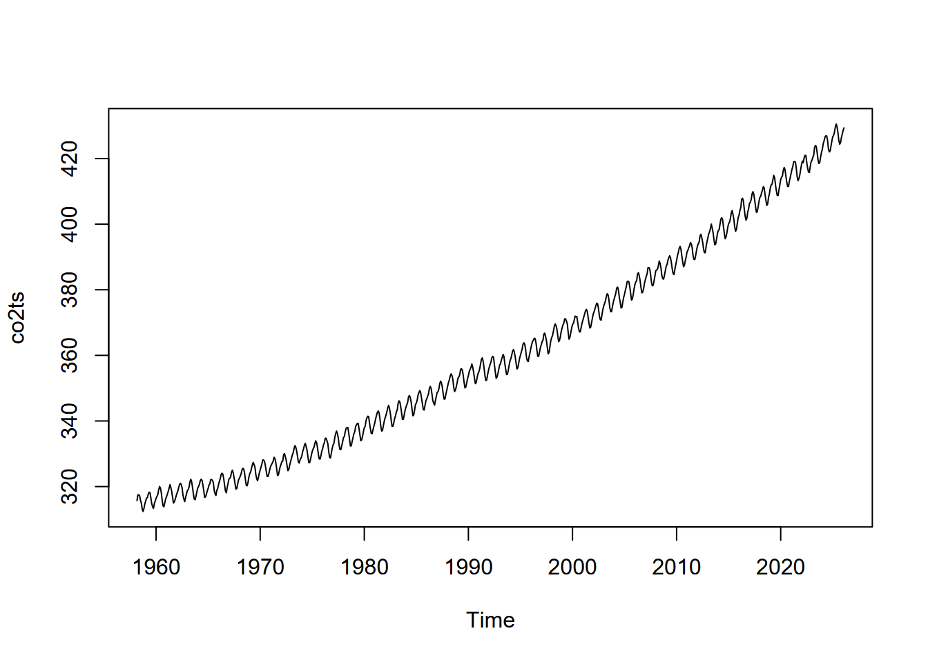 In the greenhouse gas data above, we not only specified frequency to determine the period, we also provided a start value of 20 to provide an actual year to start the data with. Time series don’t normally include time stamps, so we need to specify start and end parameters. This can be either a single number (if it’s the first reading during the period) or a vector of two numbers (the second of which is an integer), which specify a natural period and a number of samples into that period (e.g. which month during the year, or which hour, minute or second during that day, etc.)