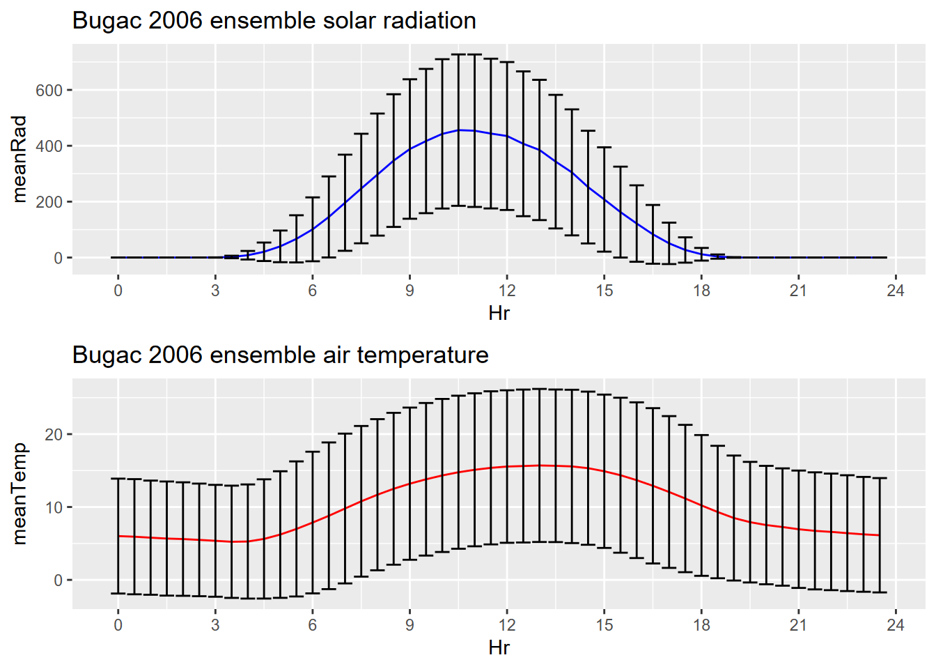 As you could see from the decomposition and sequential graphics we created for the Bugac and Manaus solar radiation and temperature data, looking at what happens over one day as an “ensemble” of all of the days – where the mean value is displayed along with error bars based on standard deviations of the distribution – might be a useful figure.
