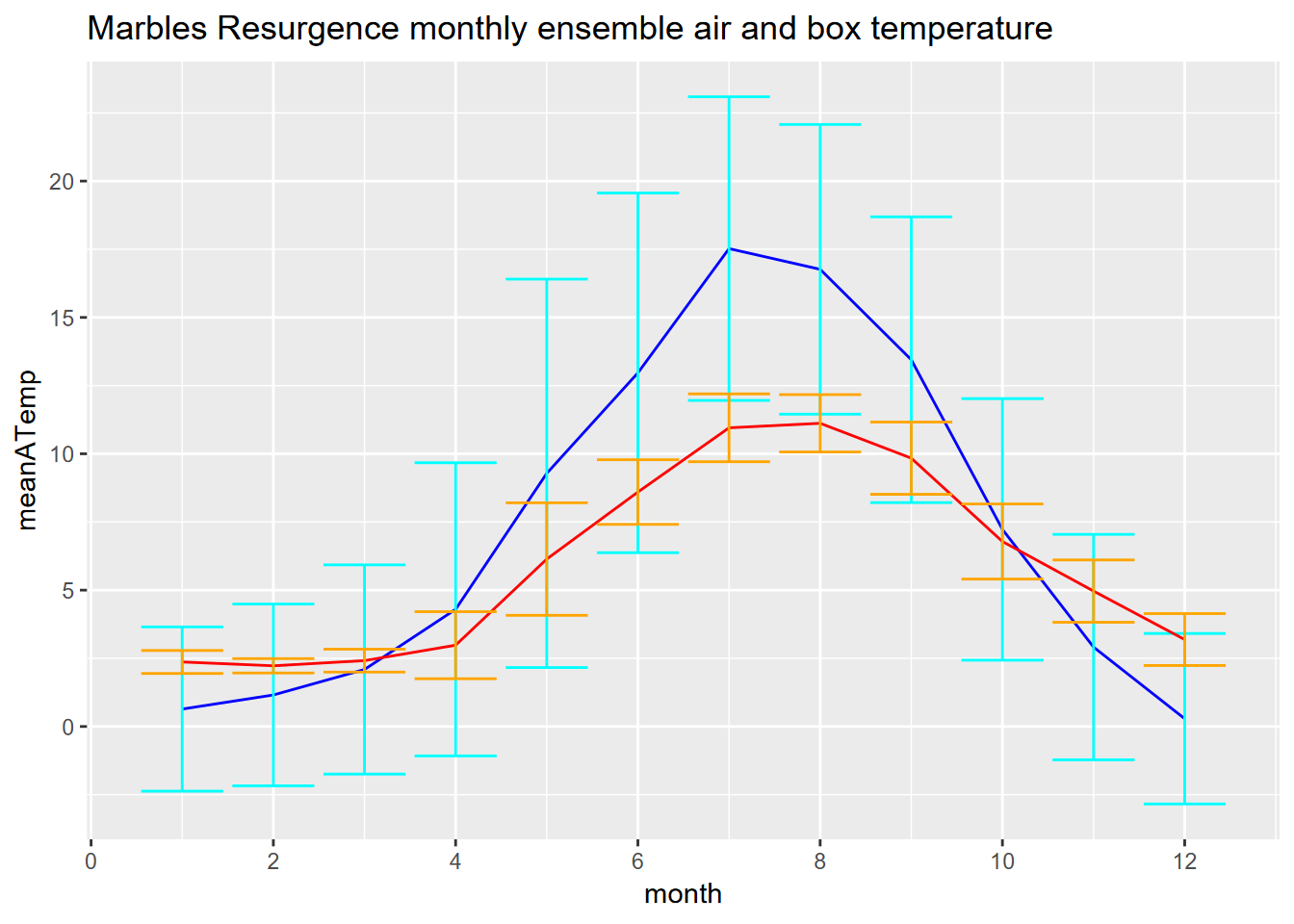 Exercise 12.7 Create an ensemble plot of monthly air and box temperature from the Marble Mountains Resurgence data. The air temperature was measured from a thermistor mounted near the ground but outside the box, and the box temperature was measured within the buried box (see the pictures to visualize this.) You’ll want to start with reading the dates and times – which we didn’t actually use when we built a time series from the data – by building date_time and month variables: