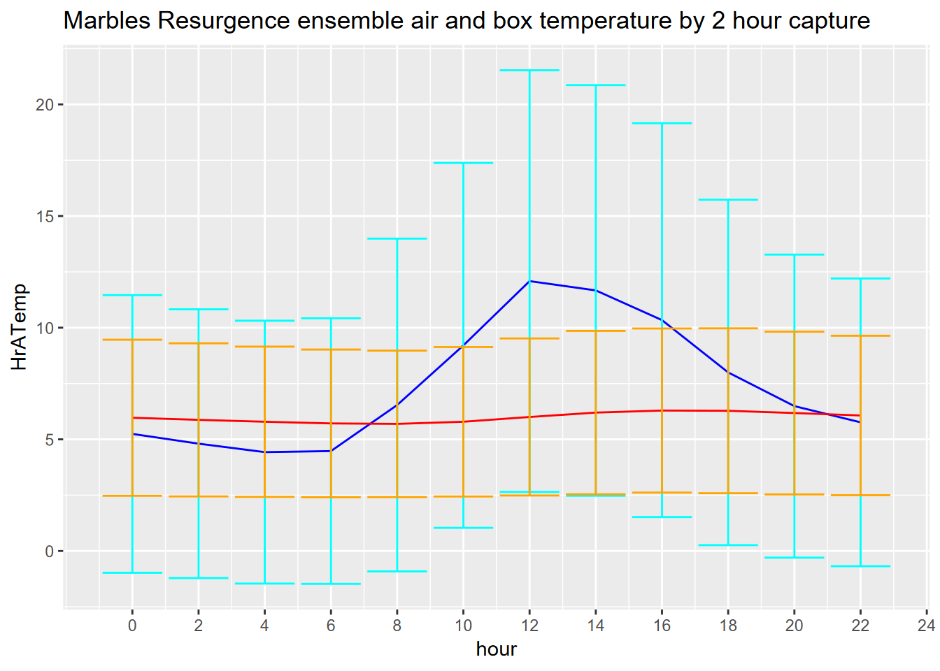 Exercise 12.8 How about looking at daily cycles? The Marbles resurgence data were collected every two hours, so group by hour (created using hour(time), which will return integers 0,2,…,22). Interpret what you get, and what the air vs box temperature patterns might show, considering where the sensors are installed.