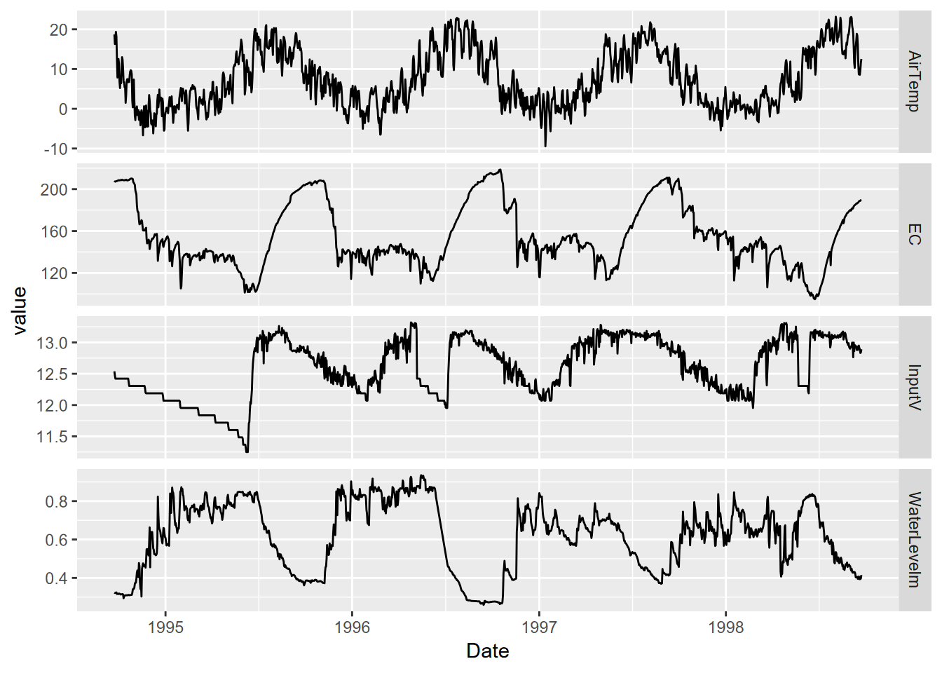 Exercise 12.9 Using methods from 12.5, create a graph of daily air temperature (ATemp), water level (wlevelm), conductance (EC), and input voltage from the solar panel (InputV) from the Marble Mountains resurgence data (Figure 12.30). Use the same type of y axis scaling as was used in figure 12.25.