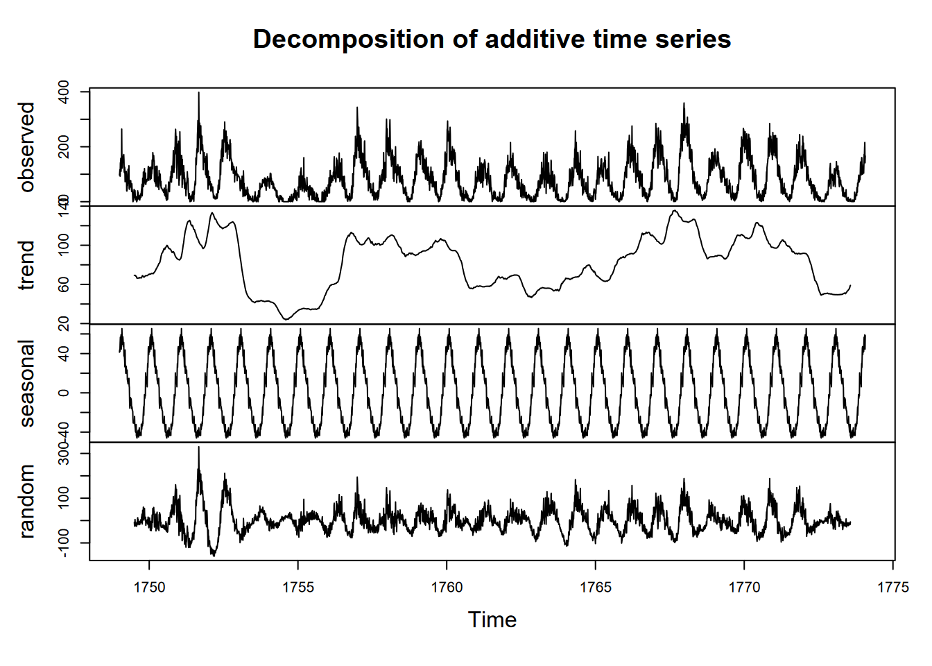 Now this is assuming that the sunspot cycle is exactly 11 years, which is probably not right, but a look at the decomposition might be useful (Figure 12.12).