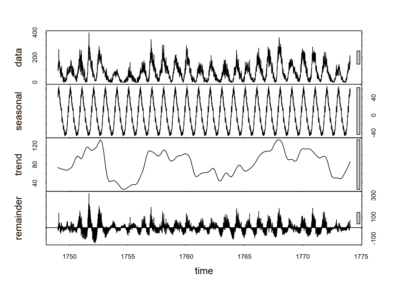 So we’ll look at a more advanced decomposition called Seasonal Decomposition of Time Series with Loess in the stl package that also provides a scale bar, allowing us to compare their amplitudes; we might, for instance, see where random variation is greater than the seasonal amplitude. If s.window = "periodic", the mean is used for smoothing: the seasonal values are removed and the remainder smoothed to find the trend, as we’ll see in the Mauna Loa CO2 data (Figure 12.5).